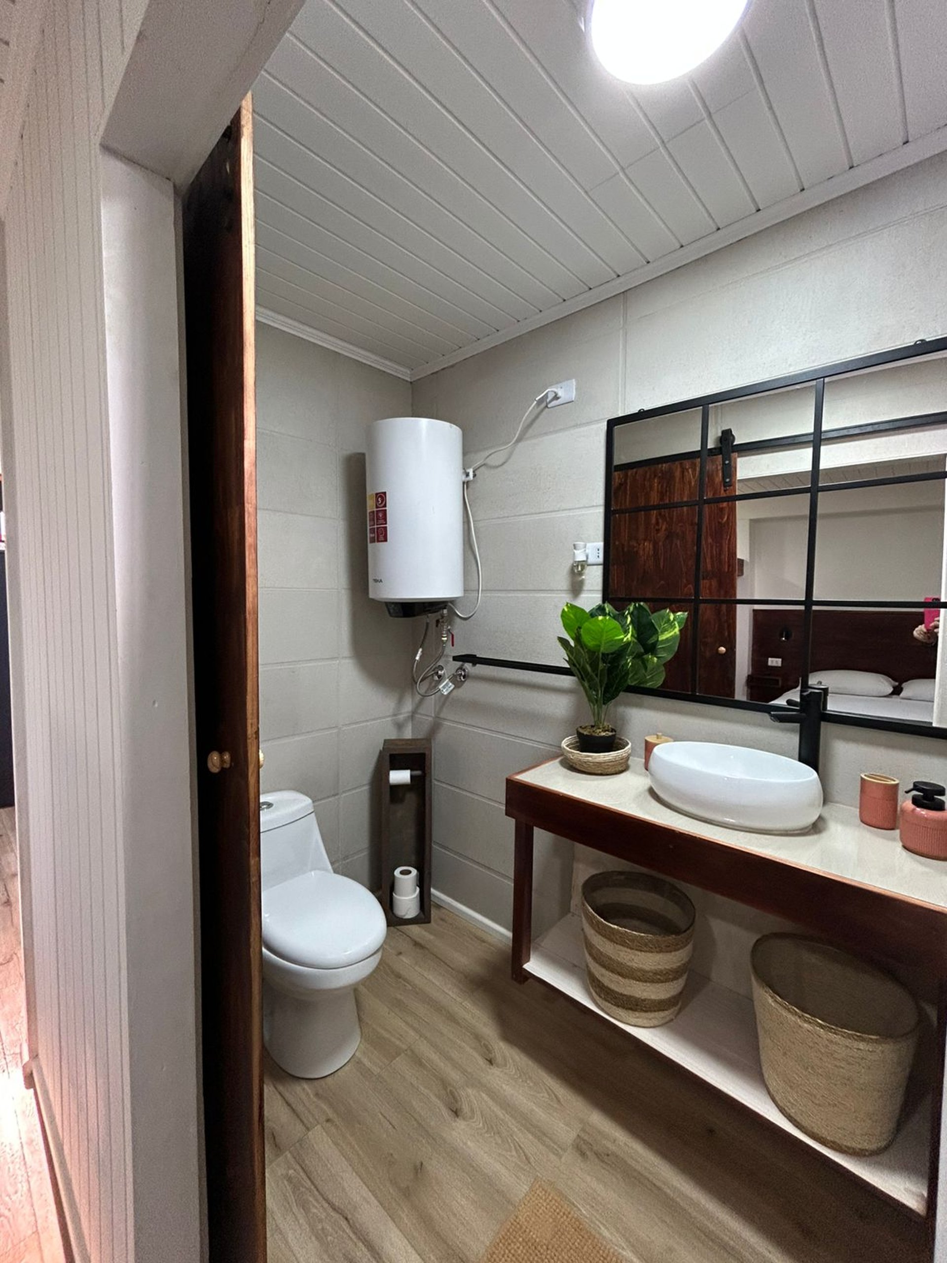 Baño: Baño moderno con ducha, lavamanos, inodoro, espejo y tomacorriente. Toallas de baño incluidas.